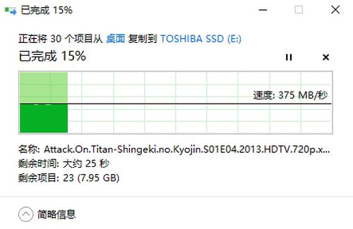 接下來,為了具體考量東芝XS700硬盤的實際讀取速度,我仍然采用同上配置的外星人電腦對其進行讀寫速度的測試,所選文件為我常用的9.35GB的視頻文件。通過測試發(fā)現(xiàn),其寫入速度為375MB/s,讀取速度為409MB/s,且速度一直維持在較高水平?jīng)]有出現(xiàn)異常波動。9.35GB視頻文件總寫入時間約為27秒,讀取時間約為25秒。從結(jié)果來看,十分令人滿意,在以往的測試和使用體驗中,諸多品牌的諸多產(chǎn)品中,東芝的“性能王”當(dāng)之無愧。