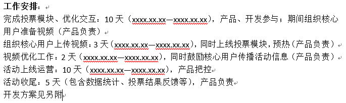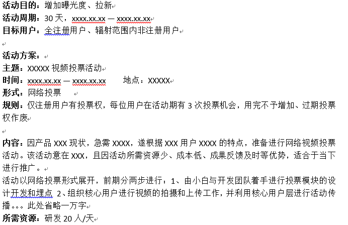 活動目的:組織活動的意義?;局挥幸粋€主要目的,可酌情綴上幾個連帶小目標(比如一個億) 活動周期:活動的周期。與活動時間不同,包含前期準備、后期收尾等等。。根據(jù)不同活動,寫清具體時間 目標用戶:活動的對象。你的產品有Hin多用戶的時候,一定要好好考慮這個問題,切記不要打擾到非相關用戶 活動方案:包含 活動背景、活動主題、主辦承辦、活動時間地點(具體)、形式內容、文案、規(guī)則、推廣方式、經費預算、所需資源等等,只要是牽扯到的,一定要詳細說明!敲黑板!看重點! 工作安排:方案定了,但沒進行工作安排?港真,作者我是不信的 風險把控:不想眼淚在風中顫抖,就一定做好風險把控,列個小表格把預計風險、風險描述、危害程度、解決方案啥的,統(tǒng)統(tǒng)寫進去,只要把控得當,風險?大可不必驚慌~~眨眼 結果展望:操心勞力的,會有什么收獲啊、能完成什么目標啊、可以起到什么戰(zhàn)略意義啊等等,切記別好高騖遠,亂寫一通出了問題,可別怪該配合出演的作者,演視而不見喲~