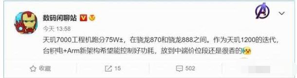 PS:目前驍龍870的跑分在70萬分左右,而驍龍888的跑分在80萬分左右,聯(lián)發(fā)科天璣7000恰好處在二者之間。