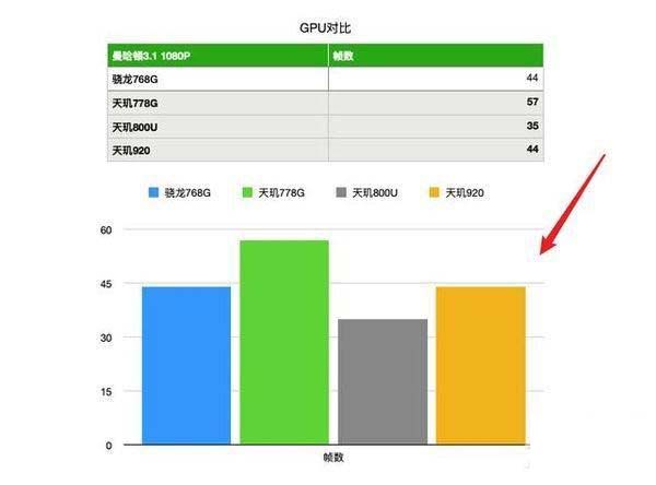 其次,根據(jù)官方消息,天璣920的游戲性能比起天璣900有9%的提升,我們就按照GPU性能提升9%來算。在曼哈頓3.1中,天璣900的成績是41幀,提高9%后就是44——也就是說,天璣920的GPU性能勉強可以和驍龍768G打平,但是要比驍龍778G弱23%。