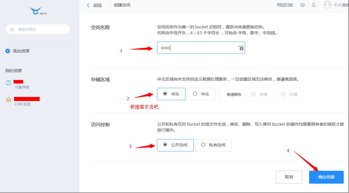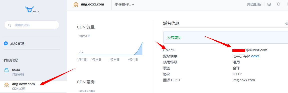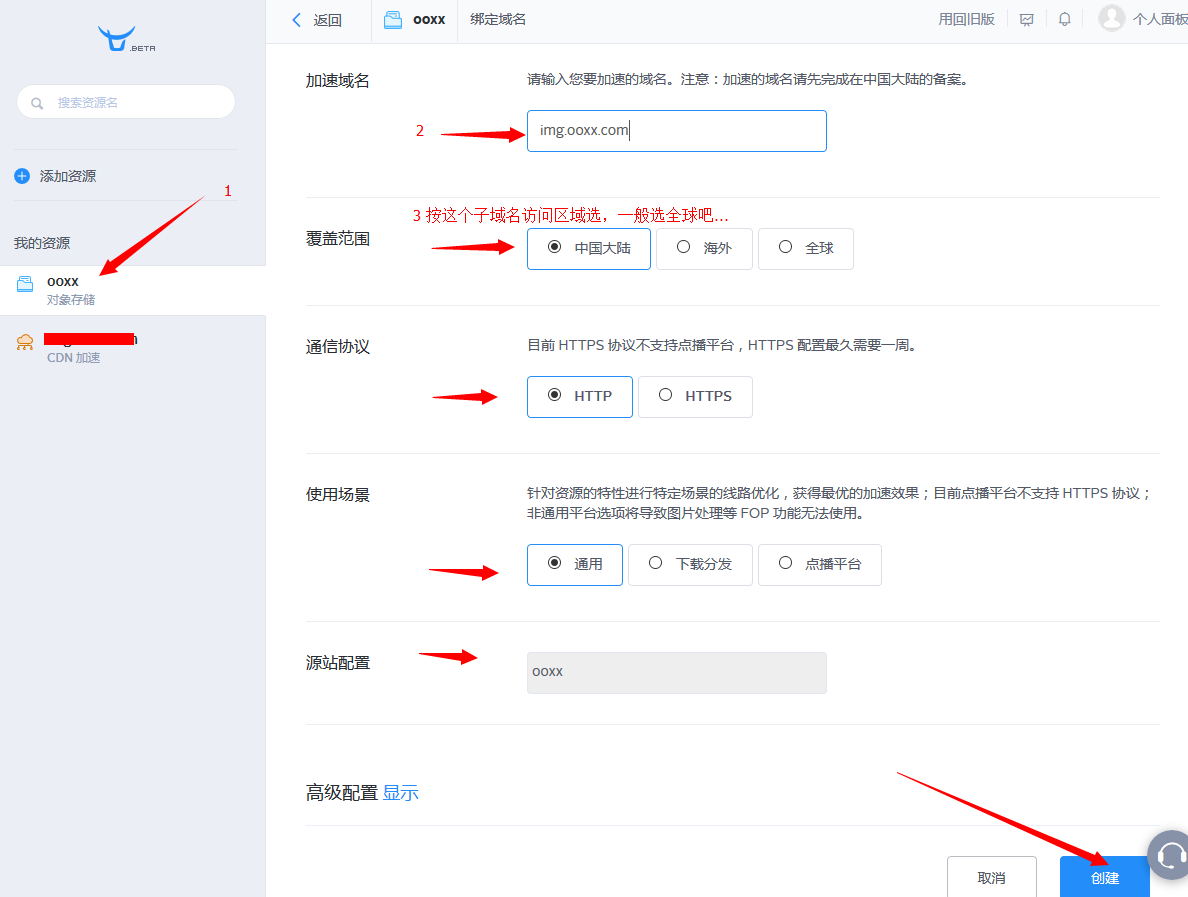 4.創(chuàng)建好后,就會在側邊欄“我的資源”顯示出來,如樣例中的是 ooxx(對象存儲),點擊它,然后參照下圖綁定域名(提示:不綁定也可以,可以用七牛提供的3級域名)