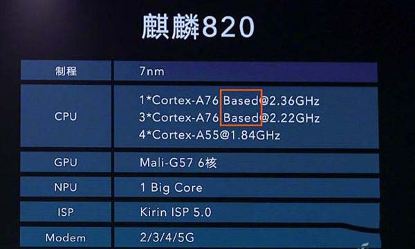 在CPU方面,麒麟820此次采用了“三叢集”設(shè)計(jì),由1個(gè)Cortex-A76 Based大核(2.36GHz)+3個(gè)Cortex-A76 Based中核(2.22GHz)2+4個(gè)Cortex-A55小核(1.84GHz)構(gòu)成。請(qǐng)注意大核和中核的“Based”后綴,它意味著麒麟820的大核和中核都是基于ARM原生Cortex-A76架構(gòu)“魔改”而來,類似高通驍龍Kryo核心。實(shí)際上,在麒麟990時(shí)代,它的大核和中核也是基于Cortex-A76魔改。