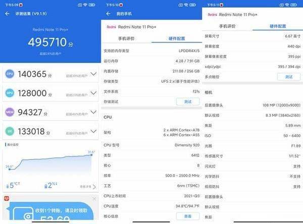 安兔兔V9的實(shí)測(cè)結(jié)果,可以看到,在49.5萬(wàn)+;而從一些細(xì)節(jié)可以看到,Redmi Note 11 Pro+的這顆CPU,采用的是比較先進(jìn)的6nm工藝,僅次于一些旗艦芯片的5nm,所以在制程上面,完全不必?fù)?dān)心。