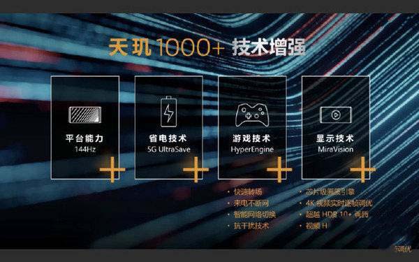 天璣1000+處理器是天璣1000處理器升級版,在前者的基礎(chǔ)上進(jìn)行了較大幅度的升級。表現(xiàn)在四個方面,支持144Hz屏幕高刷新率、搭載了5G UltraSave省電技術(shù)、采用HyperEngine 2.0游戲全場景優(yōu)化、搭載APU 3.0芯片和MiraVision畫質(zhì)引擎。