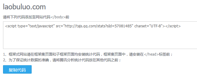 這里我們可以看到將上面生成出來的網(wǎng)站統(tǒng)計代碼放到網(wǎng)站代碼中。點擊復(fù)制代碼按鈕,然后我們才可以看到"我已完成添加"的圖標按鈕。我們將代碼部署到網(wǎng)站后,點擊完成。這里會檢測我們代碼是否添加正確,正確會有提示的。