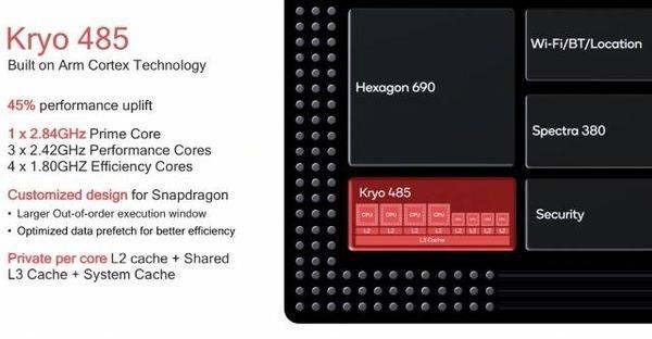 驍龍855基于7納米工藝打造,擁有8個CPU核心,為1+3+4的三叢集設計。高通驍龍855的CPU核心架構被命名為Kryo 485,官方公開表示就是基于ARM Cortex-A76架構修改而來。
