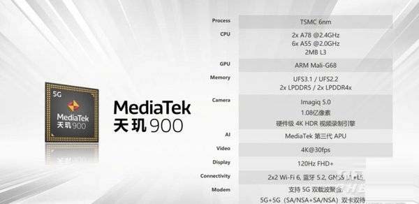 天璣900可支持LPDDR5內(nèi)存和UFS3.1閃存,還有120Hz屏幕刷新率。支持1.08億像素四攝組合及 4K HDR10+ 視頻;