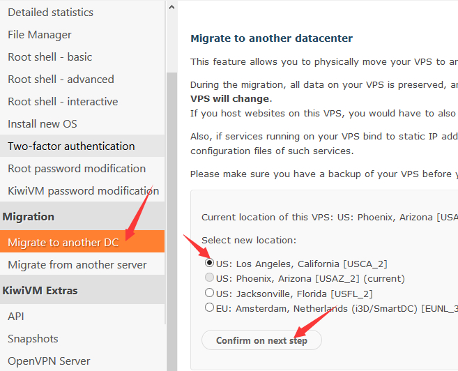 看到上圖,當(dāng)前我買的VPS是鳳凰城數(shù)據(jù)中心的,我現(xiàn)在需要更換洛杉磯機房。所以,我在"US: Los Angeles, California [USCA_2] "選擇,然后點擊下面的COMFIRM ON NEXT STEP繼續(xù)。