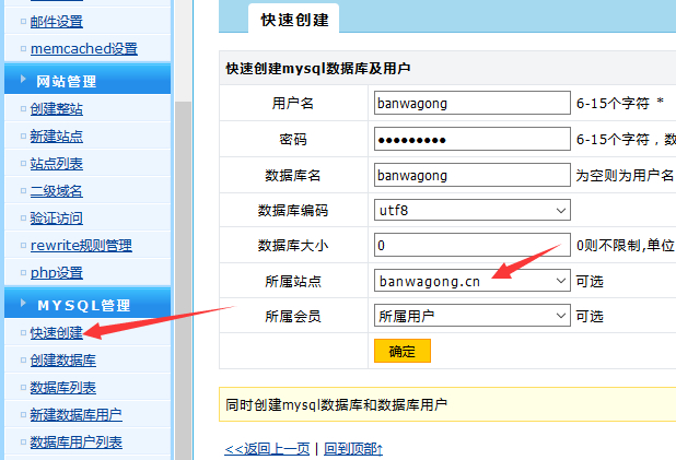 我們看到上圖 ,采用快速創(chuàng)建MYSQL數(shù)據(jù)庫的方法,輸入用戶名和數(shù)據(jù)庫名以及密碼,選擇對應(yīng)的站點域名,然后創(chuàng)建。這些信息要記錄好了,后面我們需要在安裝網(wǎng)站的時候用到。