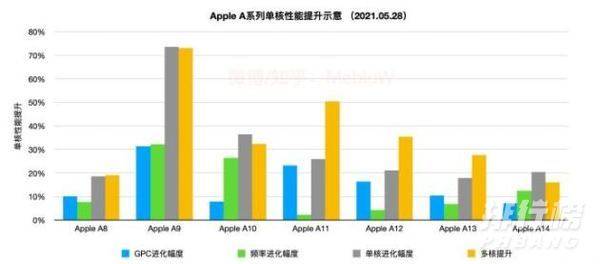 單核性能提升依賴于IPC和頻率,即便工藝沒有太大改進,可以依靠短時間的Turbo,推高單核性能。但是Apple這么多年來,一直沒能實現一代提升30%的單核性能。 A13的IPC提升10%,A14提升7%,如果按照這個路線去看,A15最多也不會有超過10%。即便按照10%估算,A15的單核心要提升20-30%,也要達到3.3G-3.5G的頻率。 總的來說如果研發(fā)特別順利20%的單核還是有一點希望(就是代價應該不?。?,但是30%就不現實了。