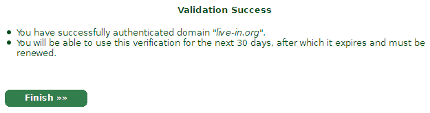 域名驗(yàn)證成功,這次驗(yàn)證在30天內(nèi)有效,過期了要重新驗(yàn)證。點(diǎn)擊Finish回到控制面板。