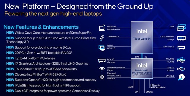 此外,全新的11代酷睿還支持Turbo Boost Max 3.0技術(shù),這使得酷睿i9-11980HK可以達(dá)到最高5GHz睿頻。而20條PCIe 4.0通道,支持RST組建RAID 0等特性,使得英特爾11代酷睿標(biāo)壓處理器的綜合體驗(yàn)得到全面提升。