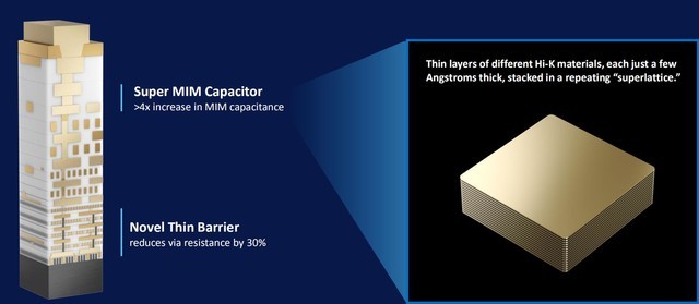其次,在改善金屬堆棧方面,英特爾大幅改善了中低層電阻,并大量使用導(dǎo)通孔。同時(shí),在晶體管頂層還增加了2層額外的高性能層,以使其達(dá)到更高的峰值頻率。此外,通過提升MIM電容器能力,11代酷睿處理器可以勝任更高負(fù)載的任務(wù),提供快速而穩(wěn)定的供電響應(yīng)。