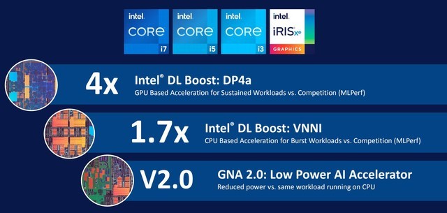 除了制程和架構(gòu)優(yōu)化升級(jí)之外,英特爾11代酷睿引入了三大人工智能加速引擎,它們是:Intel DL Boost:VNNI,Intel DL Boost:DP4a,以及Intel Gaussian&Neural Accelerator。