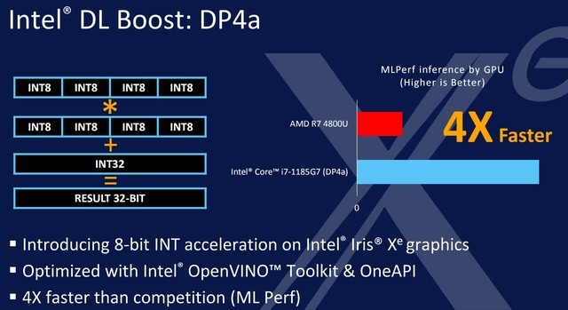 Intel DL Boost:DP4a是Xe核顯的標(biāo)志性指令之一。它使用32位元累積來計(jì)算,一個(gè)4位淺層矢量點(diǎn)積,從而加快了8位元整數(shù)推斷。這種強(qiáng)大的4元素矢量點(diǎn)積擴(kuò)展,經(jīng)過優(yōu)化之后加速了用于人工智能的推斷,并且在深度學(xué)習(xí)中也有所應(yīng)用。