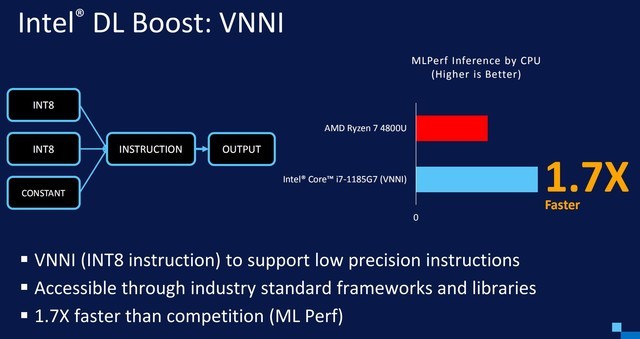Intel DL Boost:VNNI并非首次出現(xiàn)在酷睿平臺(tái)之上。英特爾在11代酷睿上繼續(xù)沿用了這一技術(shù)。VNNI為處理器提供了卓越的人工智能性能或矢量神經(jīng)網(wǎng)絡(luò)指令,可以加速基于卷積神經(jīng)網(wǎng)絡(luò)的算法。它把此前的三個(gè)獨(dú)立指令,也就是一個(gè)矢量相乘和兩個(gè)矢量相加,整合成一個(gè)矢量點(diǎn)積指令,從而提供比競(jìng)品高1.7倍的性能。