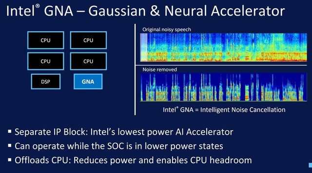 Intel Gaussian&Neural Accelerator,即GNA2.0,是英特爾打造的低功耗人工智能加速器。它專門針對(duì)工作流負(fù)載進(jìn)行了優(yōu)化,比如在聽寫、翻譯或是動(dòng)態(tài)降噪方面,能夠幫助用戶提升體驗(yàn)。如視頻會(huì)議過程中的背景消噪,就是其典型應(yīng)用場(chǎng)景。