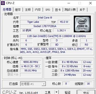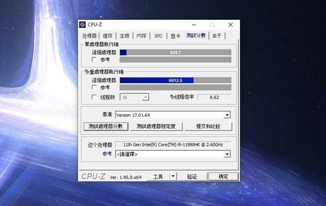 CPU-Z同樣可以給出處理器的單核和多核性能,在這一測(cè)試標(biāo)準(zhǔn)下,酷睿i9-11980HK單核得分624.7,多核得分6012.5,整體性能表現(xiàn)出色。