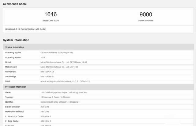 Geekbench 5通過各種科學(xué)計(jì)算、多核心計(jì)算等測(cè)試項(xiàng)目,對(duì)處理器單核和多核性能給出直觀評(píng)分。在這一測(cè)試標(biāo)準(zhǔn)下,英特爾11代酷睿i9-11980HK處理器單核得分1646,多核得分高達(dá)9000分,綜合表現(xiàn)出色。