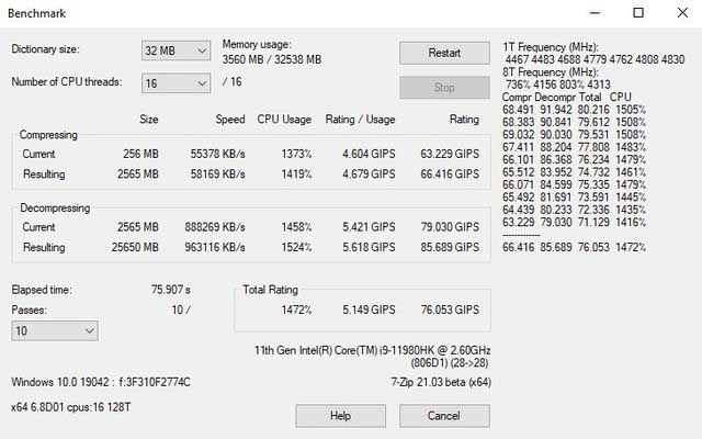 在日常應(yīng)用中,很多地方都會(huì)涉及到處理器的壓縮/解壓縮能力,我們使用7-Zip Benchmark程序?qū)犷9-11980HK處理器進(jìn)行了這方面的測(cè)試。我們測(cè)試時(shí)選擇的字典大小為32MB,CPU線程數(shù)為16線程,壓縮性能方面,CPU利用率高達(dá)1419%,評(píng)分66.416GIPS;解壓縮方面,CPU利用率高達(dá)1524%,評(píng)分85.689GIPS;10次測(cè)試完成后,CPU平均利用率1472%,總體評(píng)分76.053GIPS,說明酷睿i9-11980HK處理器擁有目前業(yè)界數(shù)一數(shù)二的壓縮與解壓縮效率。