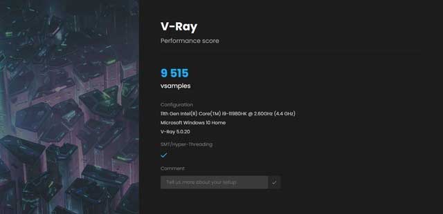 物理渲染方面,我們來看V-Ray Benchmark的測(cè)試結(jié)果。在該項(xiàng)測(cè)試標(biāo)準(zhǔn)下,實(shí)測(cè)性能評(píng)分達(dá)到9515 vsamples,說明酷睿i9-11980HK擁有非常高效的物理渲染能力。