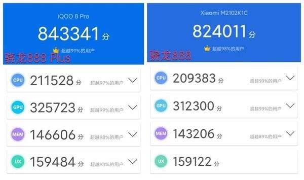 從跑分上看,搭載驍龍888 Plus機型安兔兔綜合跑分可達84萬+,而搭載驍龍888機型的綜合跑分則可達82萬+,兩者的理論成績比較接近。搭載驍龍888 Plus機型的CPU部分以及GPU部分得分都要稍高一些,當然這只是理論層面的差別,并且實際跑分成績也會有波動。