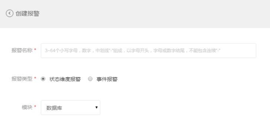 點(diǎn)擊監(jiān)控首頁左上角的「創(chuàng)建報(bào)警」,進(jìn)入創(chuàng)建報(bào)警頁面。按提示填寫報(bào)警名稱,選擇報(bào)警類型。