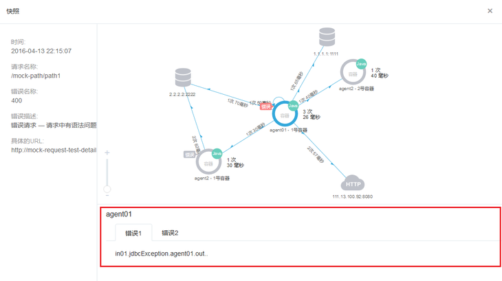 點(diǎn)擊照相機(jī)圖標(biāo),你可以看到這次請求處理中具體的調(diào)用鏈路、響應(yīng)時(shí)長、以及報(bào)出的異常信息等快照信息。