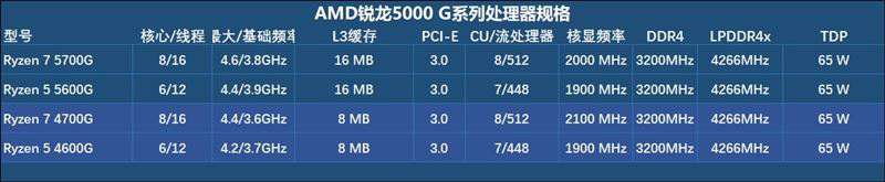 目前上市的銳龍5000G系列處理器共有2款,是銳龍7 5700G與銳龍5 5600G。與上代相比,除了緩存容量差別之外,銳龍5000G系列處理器在頻率上也有著不小的提升。