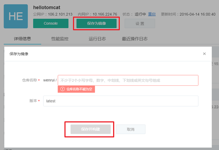 5. 確認(rèn)信息,點(diǎn)擊「保存并構(gòu)建」按鈕,開(kāi)始創(chuàng)建自定義鏡像。