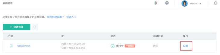創(chuàng)建成功后,可對容器進行設(shè)置。在容器列表中點擊相應(yīng)的「設(shè)置」按鈕,可設(shè)置的內(nèi)容有:容器描述和環(huán)境變量。
