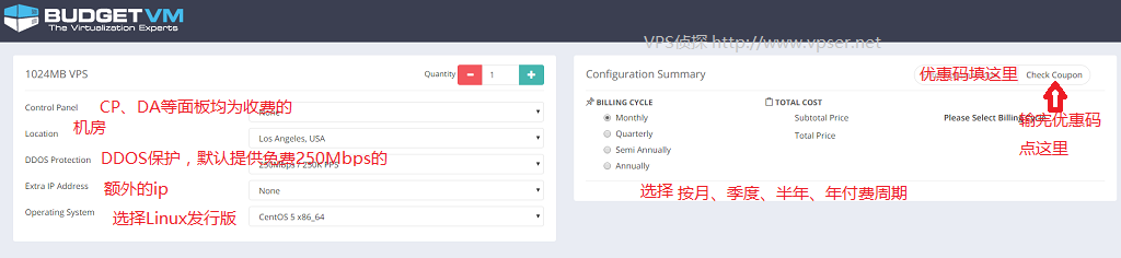 5、按上圖選擇你想要的機(jī)房、是否購(gòu)買(mǎi)額外IP、選擇系統(tǒng)等,可以按圖中注釋進(jìn)行選擇。優(yōu)惠碼:ZHANVPX3 全場(chǎng)VPS 8折終身優(yōu)惠,僅限月付。填寫(xiě)后點(diǎn)擊"Check Coupon"。