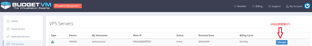 點(diǎn)擊"VPS Servers"就會(huì)進(jìn)入VPS列表,點(diǎn)擊對(duì)應(yīng)VPS后面的"Manage"就會(huì)進(jìn)入該VPS管理界面