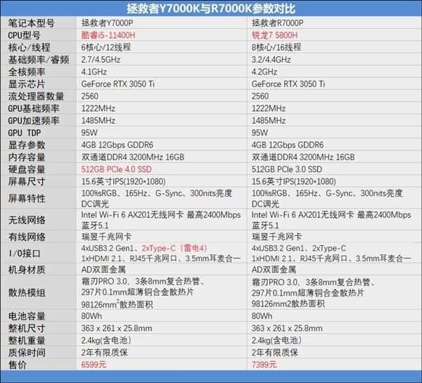 拯救者Y7000P搭載的是Intel 11代標(biāo)壓酷睿i5-11400H處理器,而R7000P搭載的是AMD最新的銳龍7 5800H處理器。二款處理器的參數(shù)規(guī)格如下:
