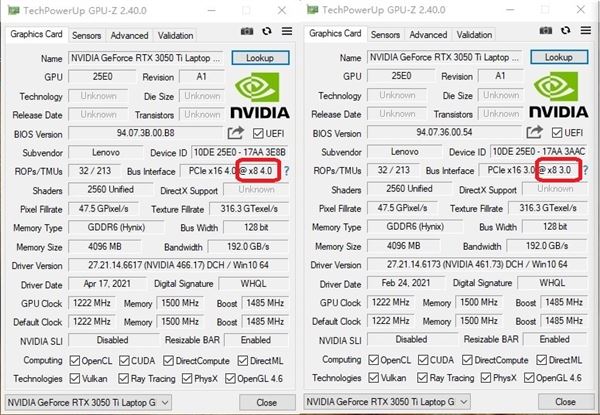 左邊是拯救者Y7000P,右邊是拯救者R7000P,可以看到2款筆記本所搭載的RTX 3050 Ti在參數(shù)方面基本上一樣,唯一的差別就是拯救者Y7000P是PCIe 4.0 x8,而R7000P是PCIe 3.0 x8。