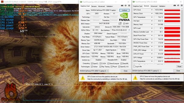 這是拯救者Y7000P,運(yùn)行FurMark 45分鐘之后處理器的功耗是94W,溫度是74.4度。