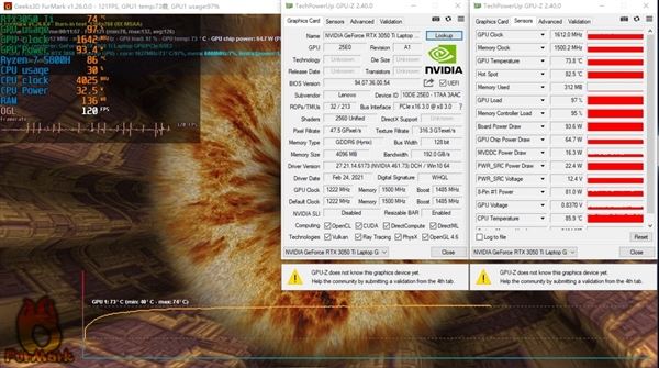 這是拯救者R7000P,運(yùn)行FurMark 25分鐘之后,處理器的功耗是93.6W,溫度是73.8度。