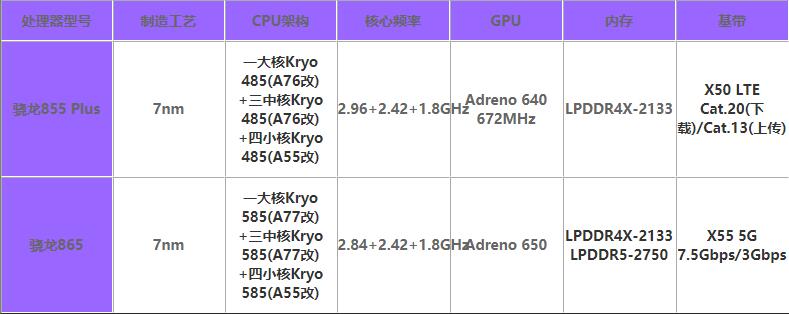 處理器型號制造工藝CPU架構(gòu)核心頻率GPU內(nèi)存基帶驍龍855 Plus7nm