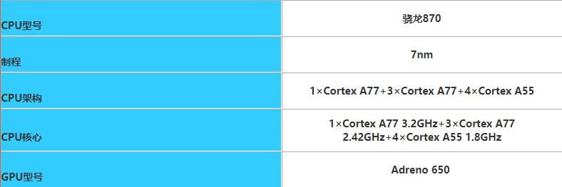 驍龍 870基于臺積電 7nm 工藝制成,包括一顆 A77(3.19GHz)超大核 + 三顆 A77(2.42GHz)大核以及四顆 A55(1.8GHz)效能核心,其他方面如 Adreno 650 和 X55 5G 基帶未變更,但 WIFI 芯片僅支持到 FastConnect 6800。