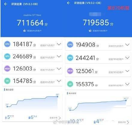 這兩款芯片差距不大,搭載天璣1200的realme GT Neo跑分711664,而搭載高通驍龍870的跑分為719585,得益于驍龍870超大核超高的頻率,高通CPU得分比天璣高出一萬分左右。