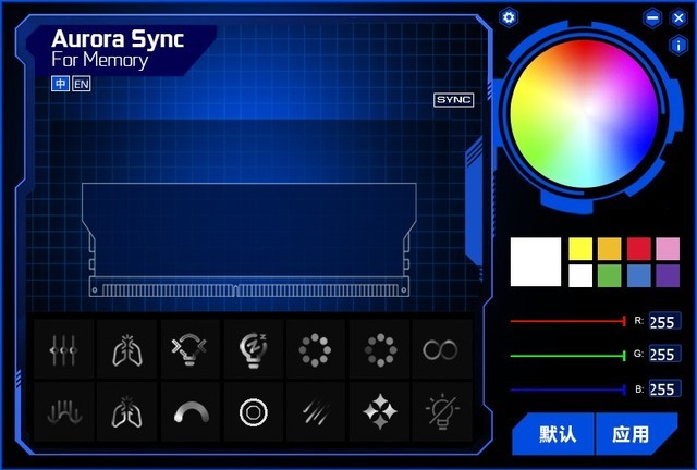 簡單介紹一下影馳Aurora Sync軟件,使用這款軟件即可對內(nèi)存的RGB燈光顏色進(jìn)行調(diào)節(jié),并且RGB的閃動方式也有很多種預(yù)設(shè),我們可以根據(jù)自己的喜好進(jìn)行調(diào)節(jié),打造別致的RGB效果。