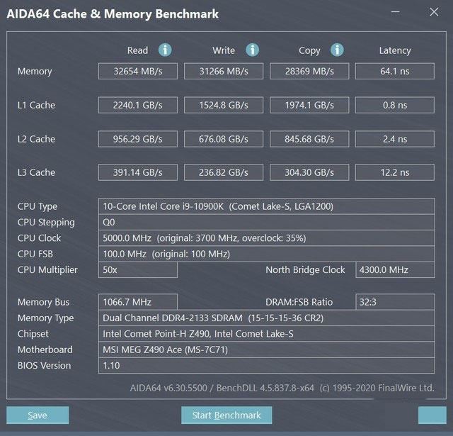 從測試中我們可以看到,當(dāng)內(nèi)存的頻率為2666MHz時,讀取速度為32654MB/s,寫入速度為31266MB/s,拷貝速度為28369MB/s,延遲為64.1ns。