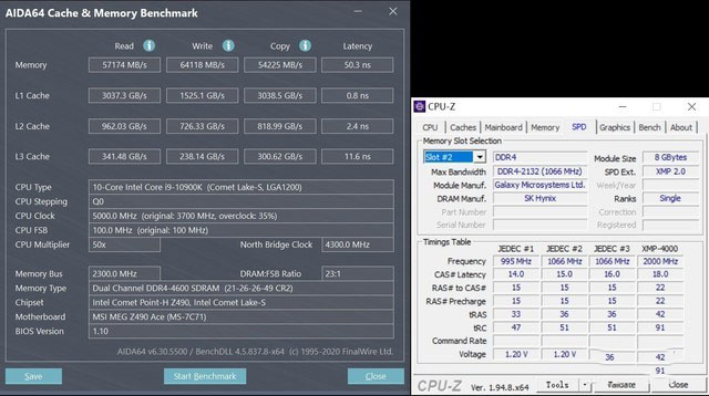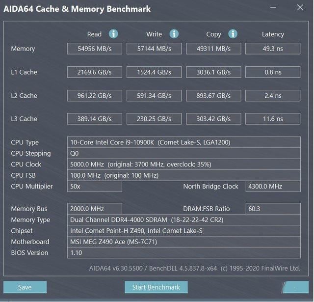 當(dāng)內(nèi)存通過XMP一鍵超頻至4000MHz后,內(nèi)存的讀取速度提升至54956MB/s,寫入速度提升至57144MB/s,拷貝速度提升至49311,延遲降低至49.3ns。