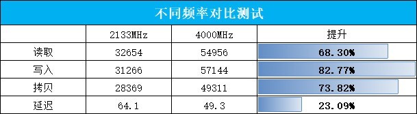 小結(jié):影馳HOF PRO RGB DDR4 4000MHz內(nèi)存通過專業(yè)軟件的對比測試,可以見得,內(nèi)存頻率的提升,對內(nèi)存性能影響較大,整體性能提升明顯,并且還降低延遲。這對于電競玩家來說,能夠有效的提高游戲幀數(shù)以及游戲運行的速度。