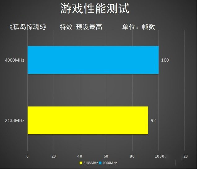 通過調(diào)整內(nèi)存的頻率,保證其他配置不變的情況下,4000MHz下的游戲幀數(shù)同比于2133MHz的游戲幀數(shù)有了顯著的提升,提升幀數(shù)為8幀。