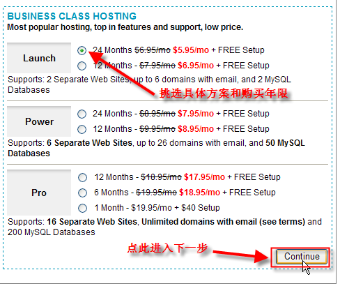 4、如果你在第2步選擇了Business Class Hosting,那么到這一步會有三個級別和相應(yīng)的租用期讓你選擇,分別是Launch,Power,Pro,它們的性能配置不同,價格也有所不同。我們以Launch方案的24個月購買期為例,然后點(diǎn)擊“Continue”繼續(xù),見下圖。