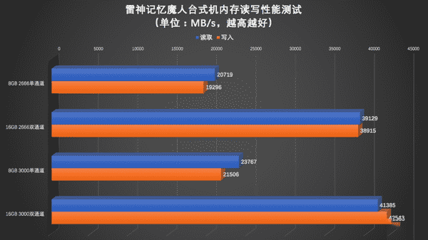 通過雷神記憶魔人臺式機內(nèi)存的理論性能測試可以看出,內(nèi)存超頻可以帶來超過10%的讀寫性能增強;從單通道升級為雙通道帶來的提升則更為明顯,在不同內(nèi)存頻率下讀取速度幾乎翻了一倍。因此,配合SSD可以讓程序啟動、加載更為順暢。