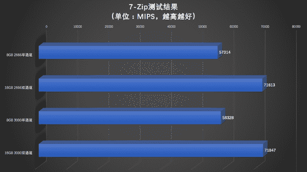 通過7-Zip以及其他理論性能測試軟件可以看出,內(nèi)存頻率提升對成績影響并不明顯,但在某些應(yīng)用中采用內(nèi)存雙通道后,總體評分有了約25%的提升。