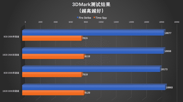 同樣,通過3DMark測試可以看到內(nèi)存頻率提升對于測試成績的影響微乎其微,但是采用雙通道后,TimeSpy測試相比單通道上升了約4%。