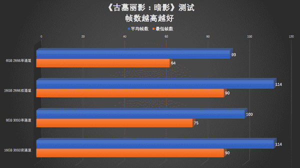 玩游戲最影響體驗的便是卡頓。而造成卡頓除了網(wǎng)絡(luò)原因外,很有可能是在某些場景下游戲幀數(shù)驟降導(dǎo)致的。換言之,PC運行游戲是否順暢,除了看平均幀數(shù)外,還需要關(guān)注其最低幀數(shù)。通過測試可以看到,同樣是內(nèi)存單通道,超頻至3000MHz后,相比默認(rèn)的2666MHz工作頻率,幀數(shù)提升了11。另外,內(nèi)存雙通道對比單通道的提升同樣十分顯著。